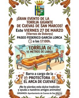 Este 27 de marzo, Cuevas de San Marcos se viste de tradición con un evento muy especial: una torrija gigante de 15 metros que promete ser el centro de atención. Además de este dulce gigante, habrá una barra solidaria para apoyar buenas causas. Es una ocasión perfecta para disfrutar en familia, sumergiéndote en las costumbres […]