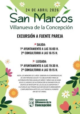 Una ruta estupenda para disfrutar en Villanueva de la Concepción es la excursión a Fuente Pareja organizada con motivo de San Marcos. La salida será desde el ayuntamiento y el consultorio, y habrá actividades pensadas para que los menores participen con todas las autorizaciones necesarias. Además de pasear por un entorno natural precioso, la jornada […]