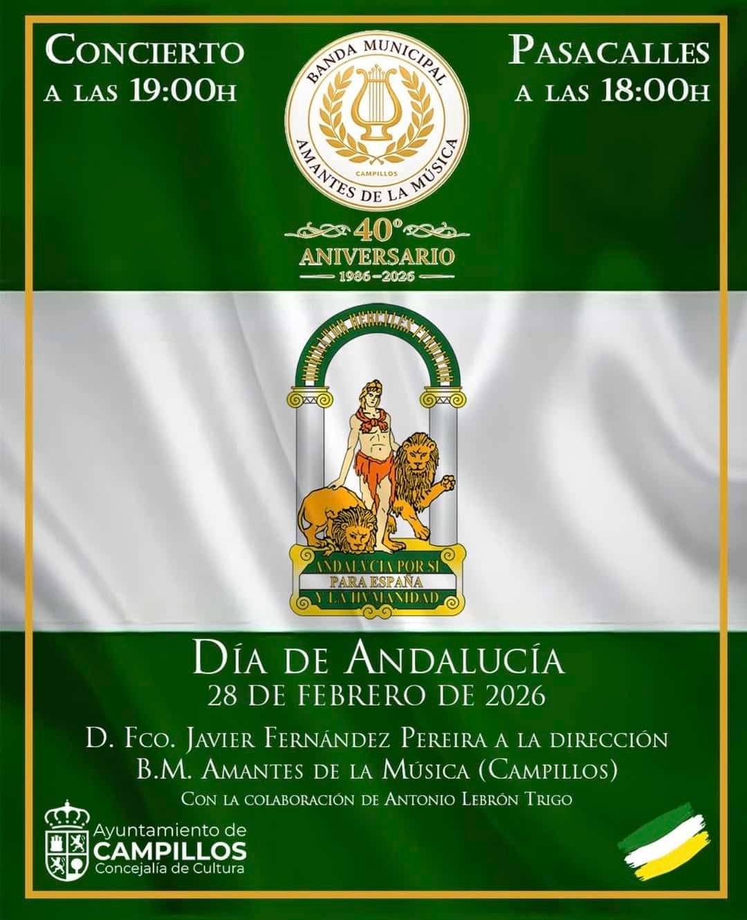La Banda Municipal Amantes de la Música conmemora sus 40 años en Campillos con una tarde llena de ritmo y tradición. La celebración arranca con un pasacalles a las 18:00, seguido de un concierto a las 19:00 que mezcla la música andaluza con piezas cofrades, creando un ambiente único para disfrutar.