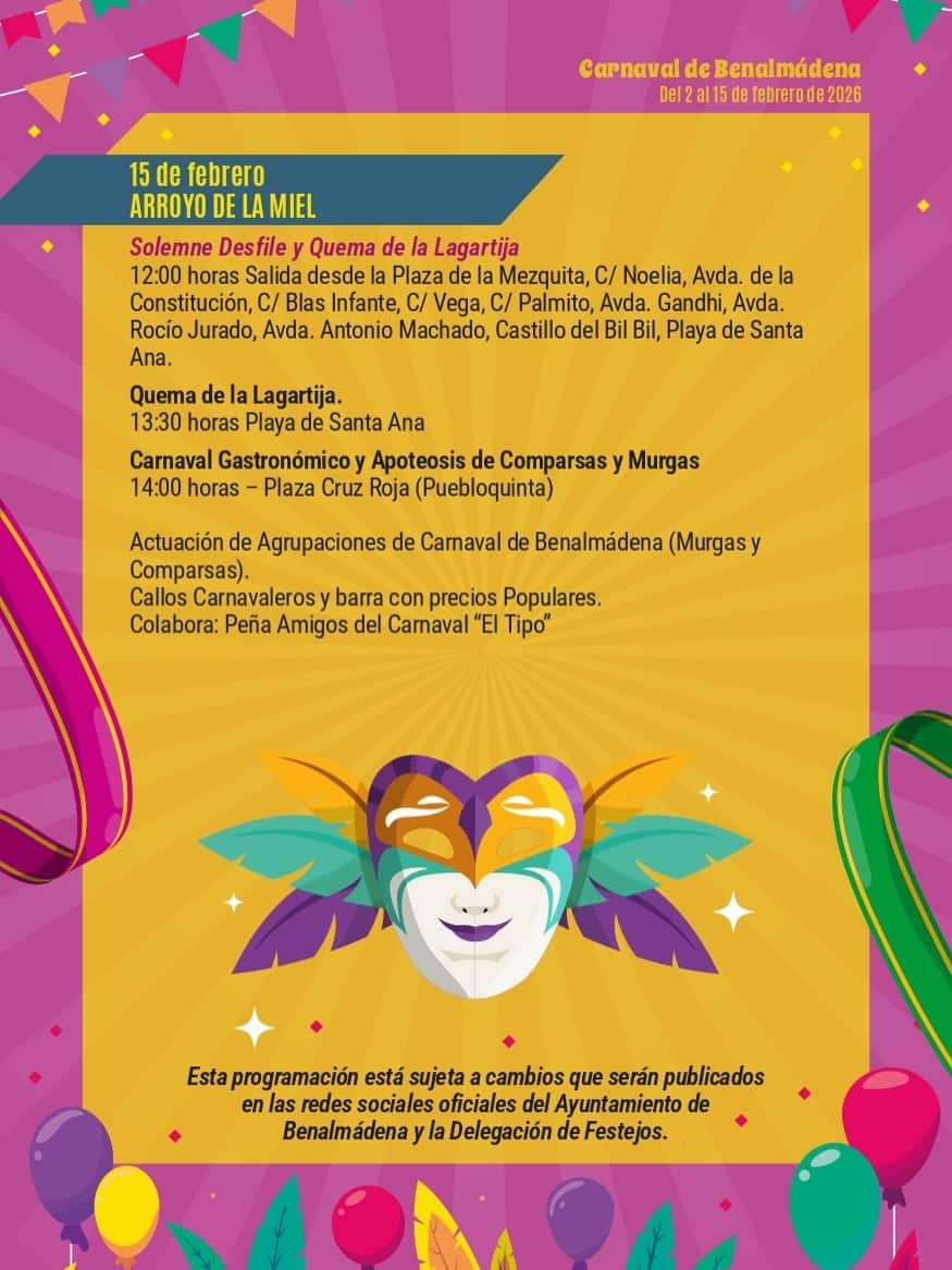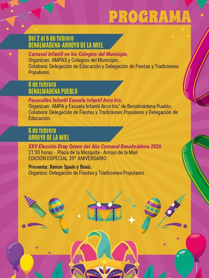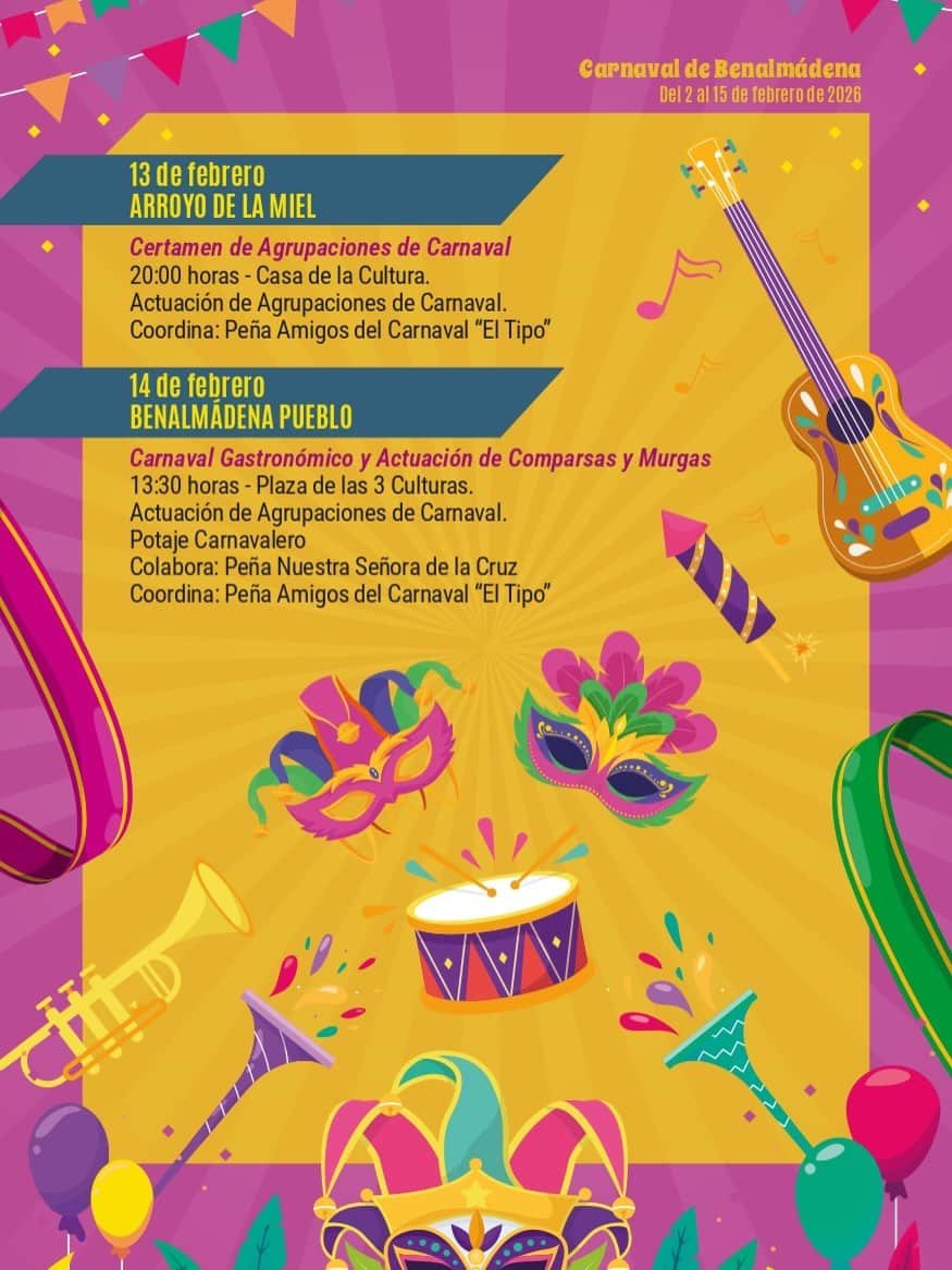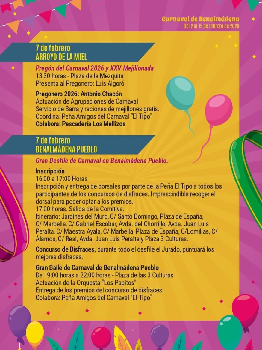 El Carnaval de Benalmádena 2026 llenará el municipio de alegría, color y disfraces. Durante esta celebración, las calles y plazas se animan con diversas actividades y desfiles que destacan por su ambiente festivo y participación ciudadana. Es una ocasión para disfrutar de una tradición que une a toda la comunidad en torno a la diversión y las expresiones culturales.