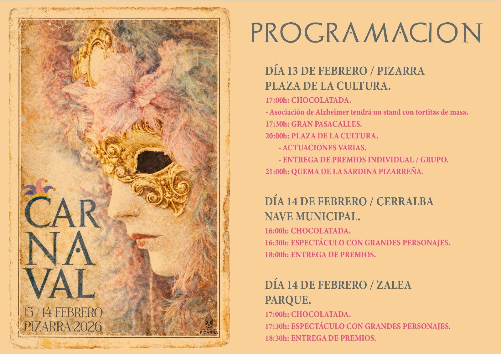 El Carnaval 2026 en Pizarra se celebra los días 13 y 14 de febrero con una programación que incluye fiestas en la plaza principal, Cerralba y Zalea.