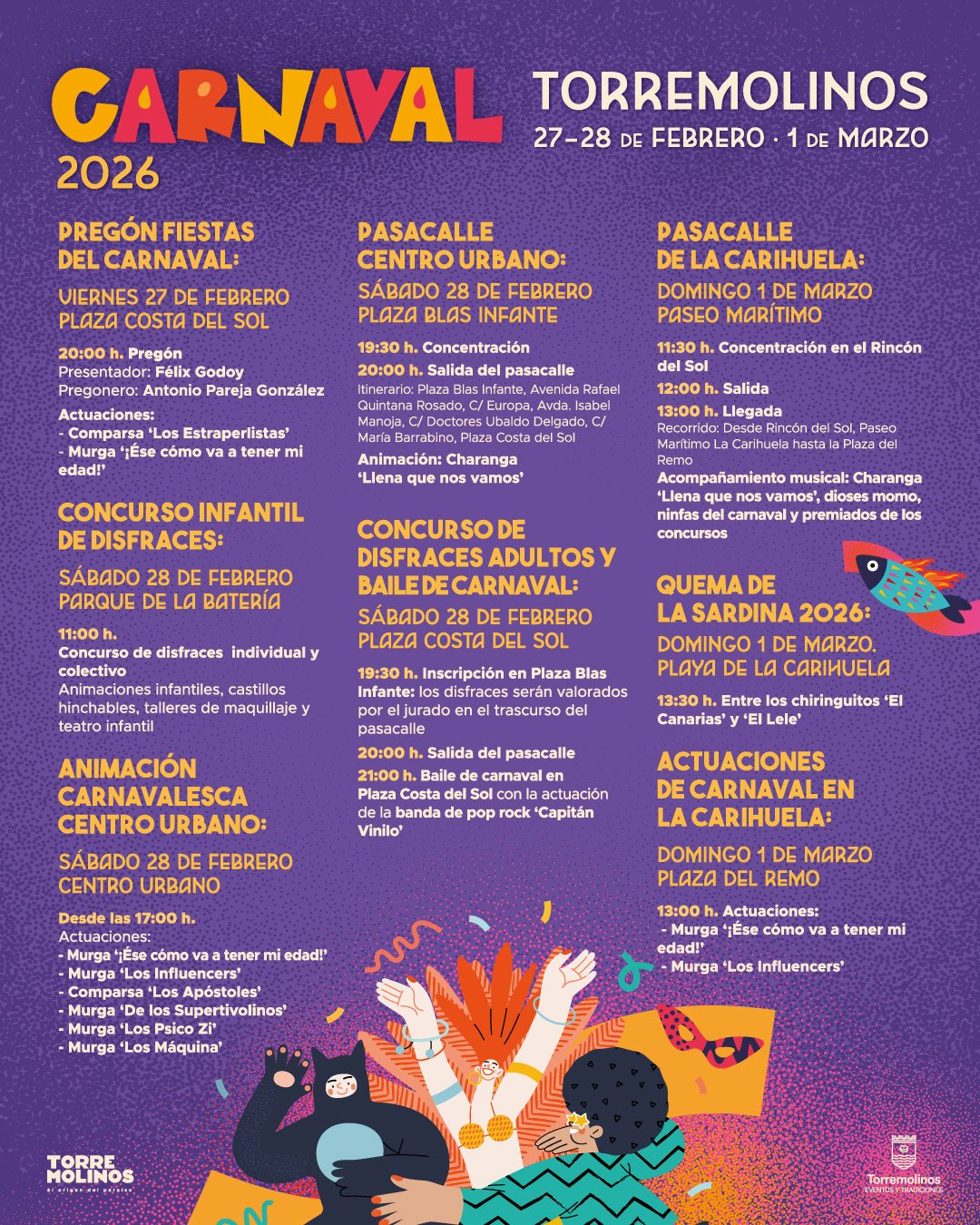 Este año el programa incluye desde el tradicional pregón hasta murgas y comparsas que animan las calles con ritmo y color. Además, habrá concursos para que la fiesta sea todavía más divertida y la clásica quema de la sardina para cerrar con broche de oro.