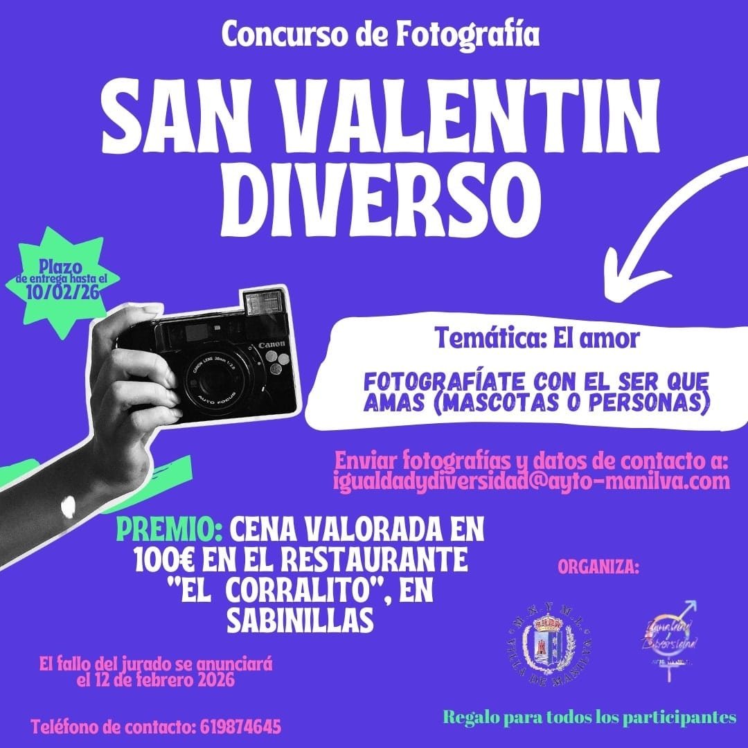 El Ayuntamiento de Manilva organiza un concurso de fotografía bajo el tema «El amor» para celebrar San Valentín Diverso. Los participantes deben enviar su foto antes del 10 de febrero de 2026. El premio es una cena valorada en 100 euros en El Corralito, un plan ideal para quienes quieran mostrar su creatividad y sentimientos a través de la fotografía.