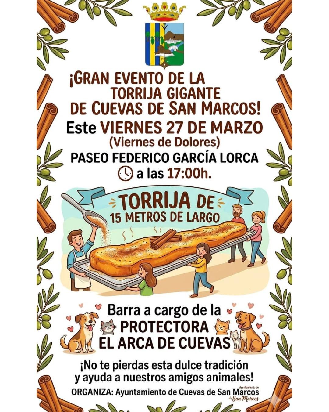 Este 27 de marzo, Cuevas de San Marcos se viste de tradición con un evento muy especial: una torrija gigante de 15 metros que promete ser el centro de atención. Además de este dulce gigante, habrá una barra solidaria para apoyar buenas causas. Es una ocasión perfecta para disfrutar en familia, sumergiéndote en las costumbres y celebraciones del pueblo.
