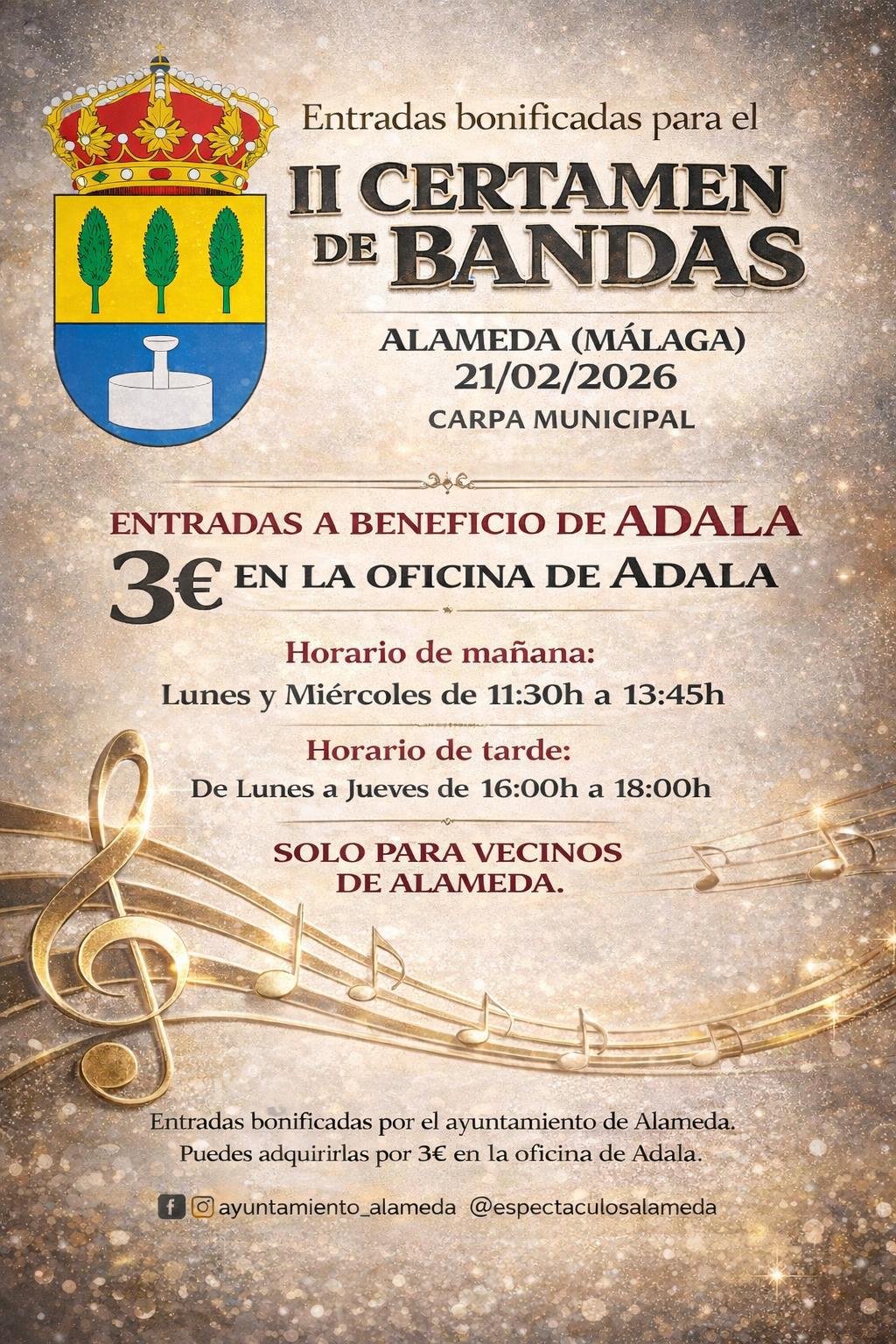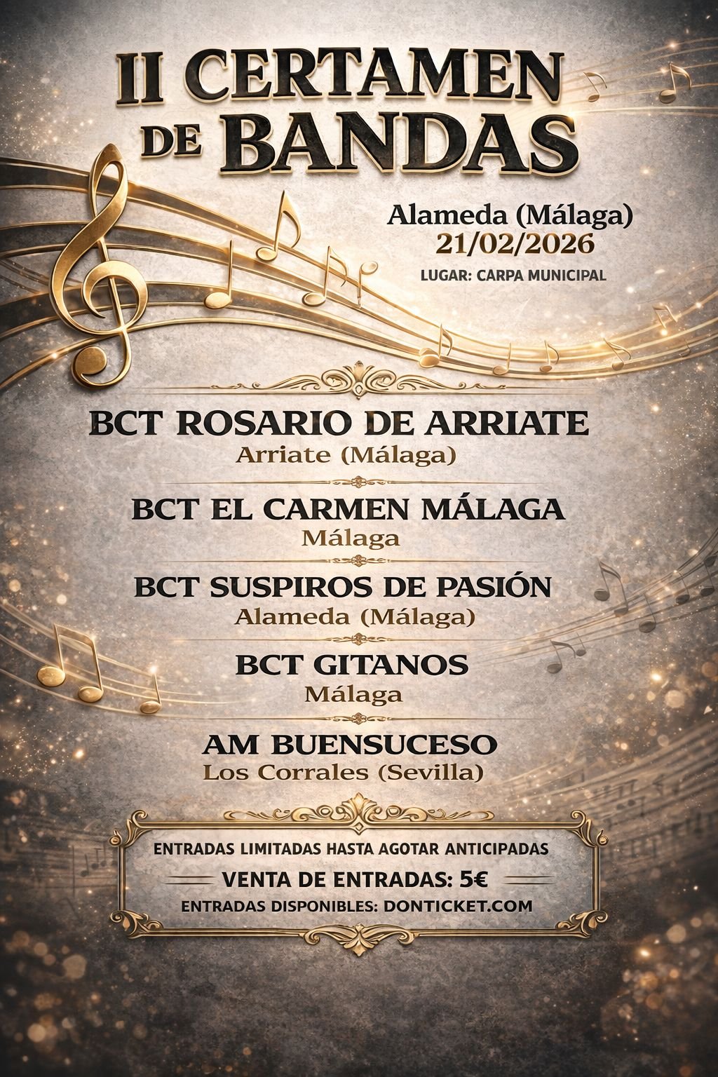 El II Certamen de Bandas en Alameda se celebra el 21 de febrero de 2026 en la Carpa Municipal. Grandes formaciones musicales se darán cita para ofrecer un espectáculo para todos los amantes de la música.