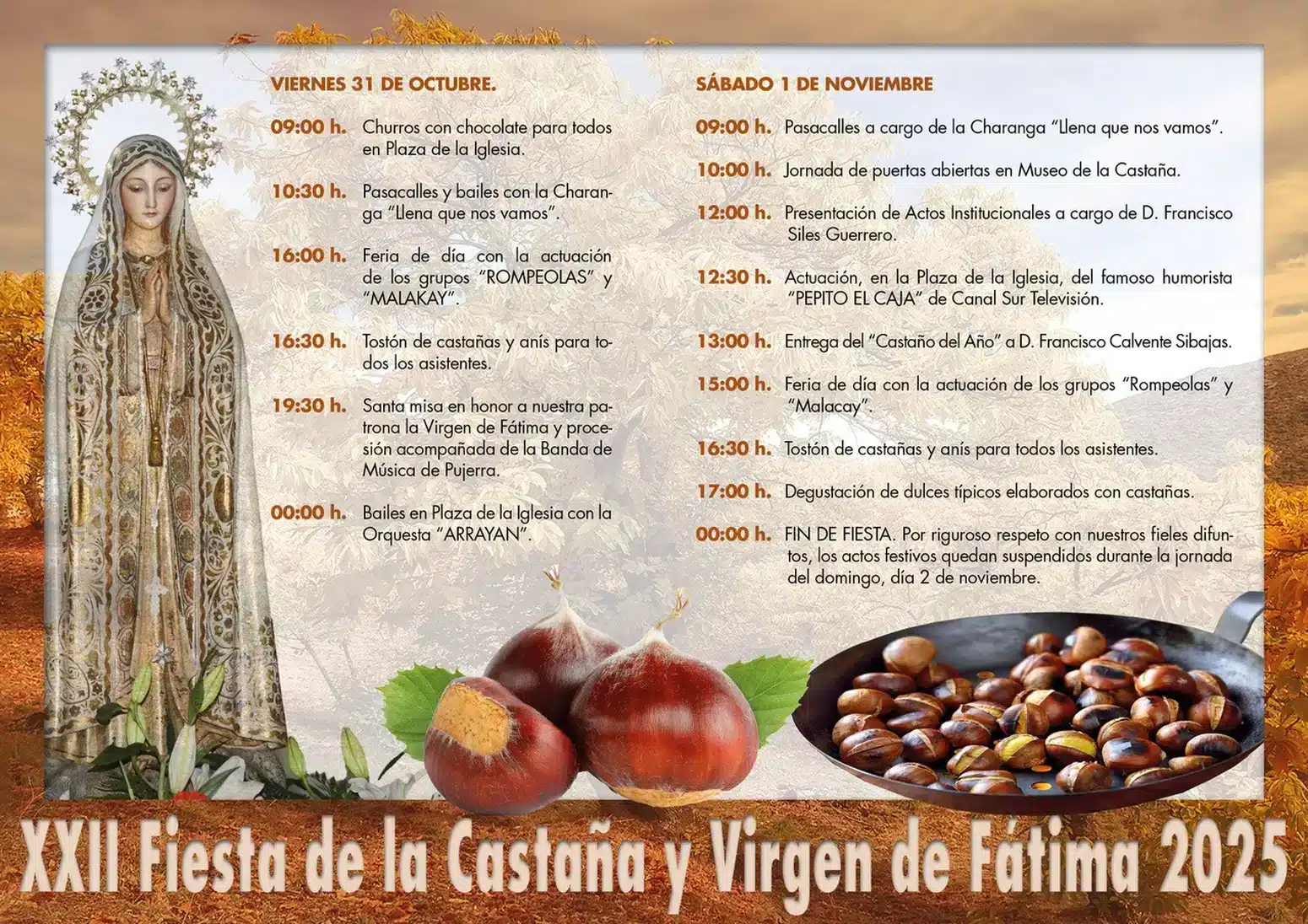 Las actividades comenzarán el viernes 31 de octubre, con un desayuno colectivo en la Plaza de la Iglesia y un animado pasacalles con la charanga Llena que nos vamos. Por la tarde, la feria de día contará con música en directo, un tostón de castañas con anís y la solemne misa en honor a la Virgen de Fátima, seguida de la tradicional procesión acompañada por la Banda Municipal de Música. La jornada culminará con la actuación de una orquesta a medianoche.