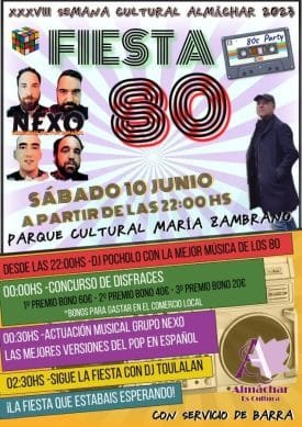 Dentro de la XXXVIII Semana cultural de Almachar el sábado 10 de junio a partir de las 22:00 h. Fiesta con música Ochentera, concurso de disfraces, música en directo y DJ. Más información en cartel.