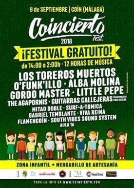¡Festival gratuito! 12 de horas de música en las calles y plazas de Coín con zona infantil y mercadillo de artesanía. Más información en cartel y en Facebook Coincierto festival