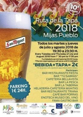 ¡Todos los martes y jueves de julio y agosto ruta de la tapa en Mijas Pueblo! Bebida + tapa 2 € a partir de las 19:30 h. Más información en cartel.